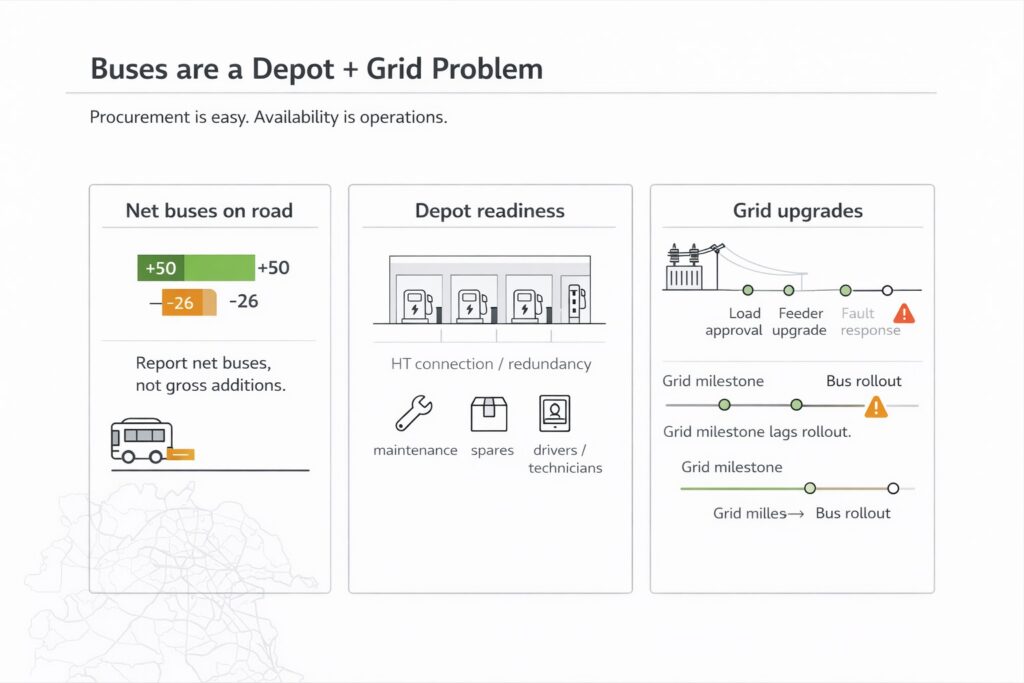 - For buses, publish “net buses on road” after retirements, not gross additions.